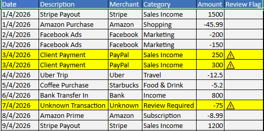 You receive a clean, structured transaction data ready for bookkeeping workflows.