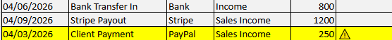 These entries represent different incoming payment sources. They have therefore been standardised into clearer descriptions so that bank transfers, Stripe payouts, and PayPal client payments can be identified separately within the dataset. The PayPal entry remains flagged for review where confirmation may still be needed.