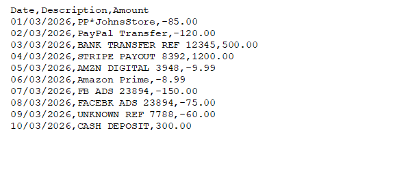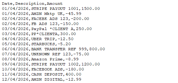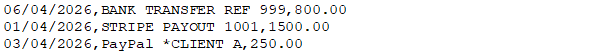 If you have a bank transaction export that needs to be prepared before bookkeeping begins, you can send a sample CSV for review.