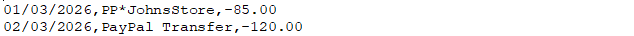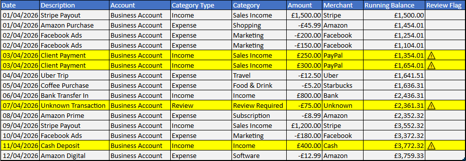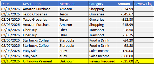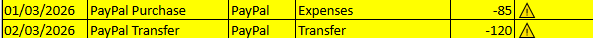 Here, PP*JohnsStore is not fully descriptive, but it indicates a PayPal transaction linked to a merchant payment rather than a direct bank transfer. It has therefore been standardised as a PayPal purchase and treated as an expense. The PayPal Transfer entry has been identified separately and categorised as a transfer. Both entries are flagged for review where interpretation may still require confirmation.