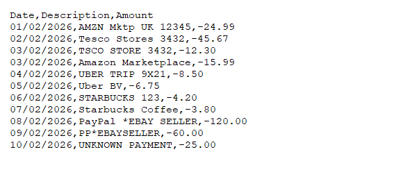 The result is a structured and bookkeeping-ready dataset, with descriptions standardised, merchants identified where possible, categories applied consistently, and unclear entries flagged for review.