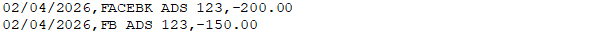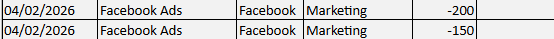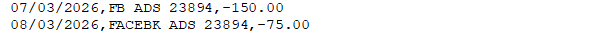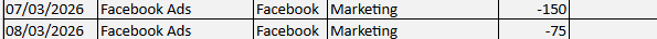 These entries refer to the same merchant but appear in inconsistent abbreviated forms. They have therefore been standardised to Facebook Ads, with the merchant identified as Facebook and the category applied consistently as Marketing.