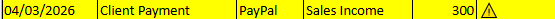 This entry includes an abbreviated PayPal reference rather than a clear payment description. It has therefore been standardised as Client Payment, with the merchant identified as PayPal and the transaction categorised as Sales Income. Because the underlying payer is not fully confirmed from the raw entry alone, the entry remains flagged for review.